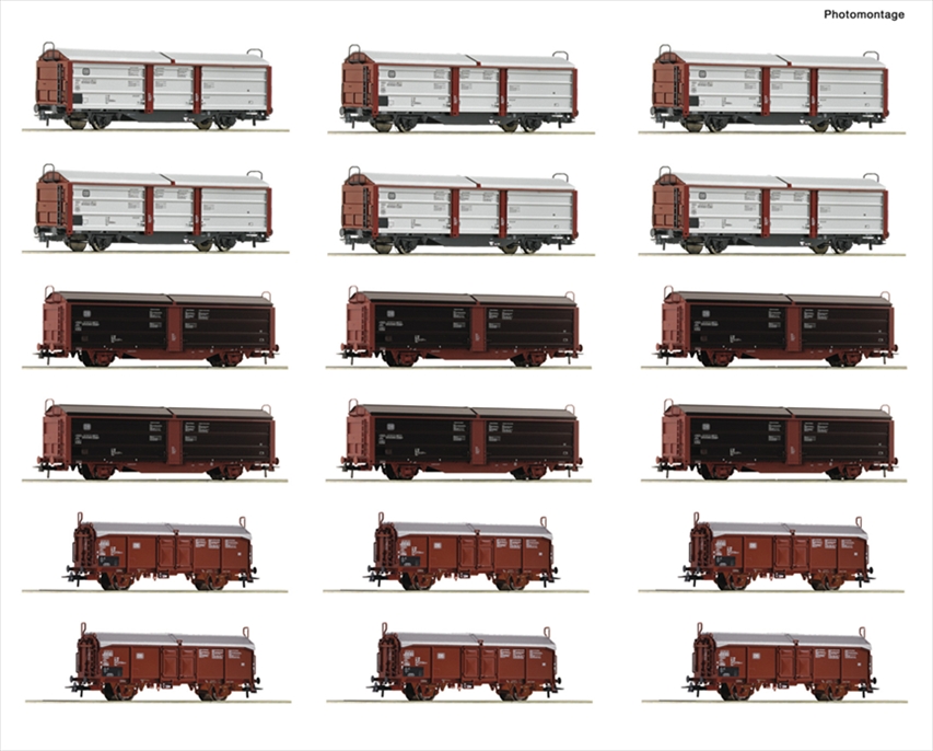6-teiliges Display: Rangierbahnhof/Schiebedach-/Schiebewandwagen der Deutschen Bundesbahn.